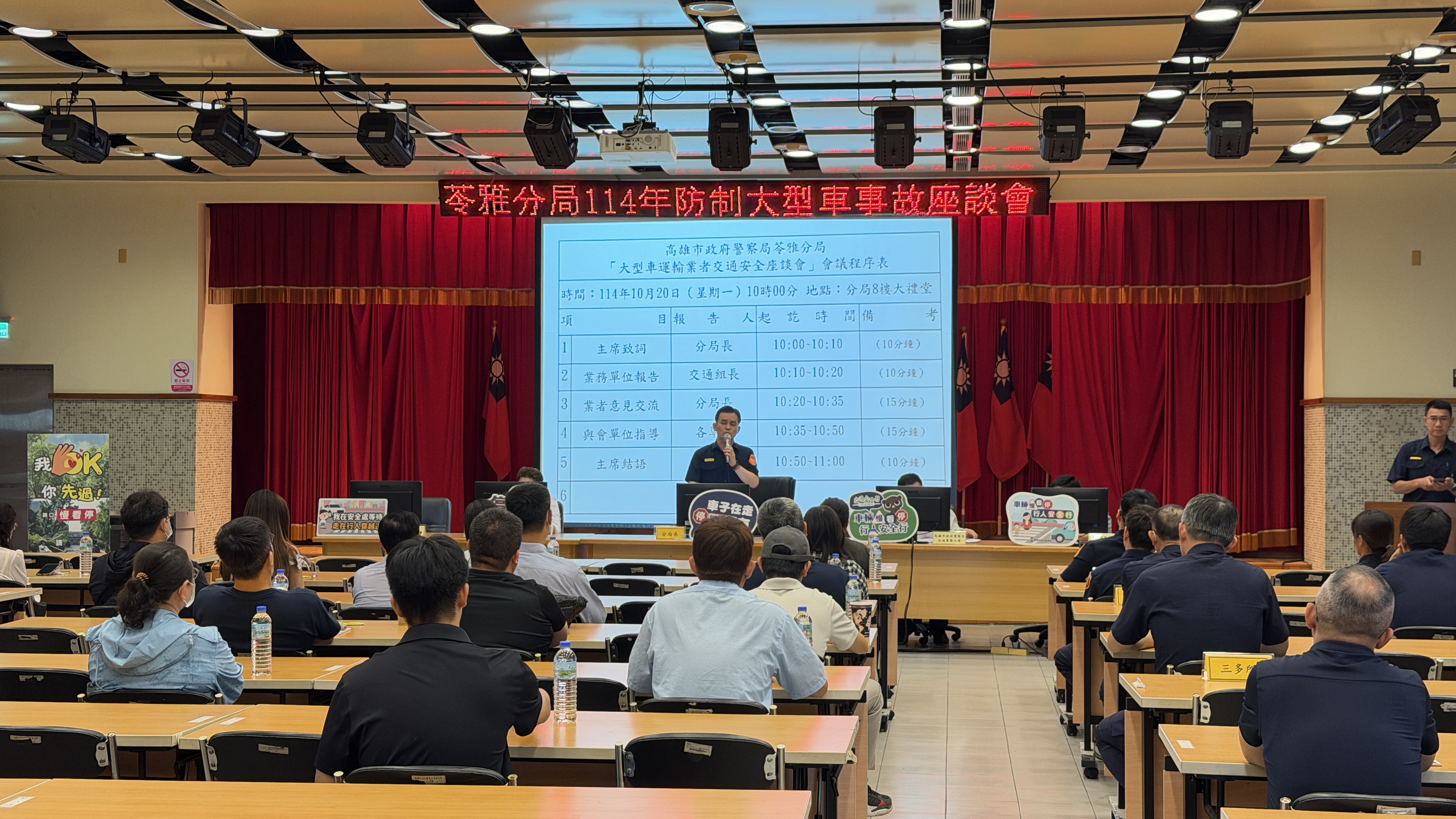 鑑於大型車交通事故經常造成嚴重傷亡,為建立大型車駕駛正確駕駛觀念、加強事故防制,苓雅分局於10月20日召開「114年防制大型車事故座談會」,邀集高雄市政府交通局、交通部公路局高雄市區監理所苓雅監理站、高雄市苓雅區公所、交通警察大隊及轄內各營造、運輸公司代表及轄內建案負責人(或駕駛人)等大型車相關單位人員共同與會。