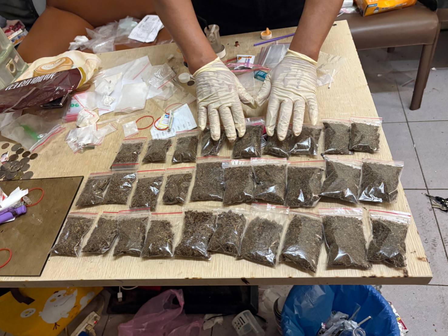 本大隊偵查第四隊11分隊與鼓山分局內惟派出所等單位,依據臺灣高雄地方檢察署英股簡檢察官婉如指揮,經分向臺灣高雄地方法院、臺灣高雄地方檢察署聲請搜索票、拘票獲准,共同執行搜索、拘提查緝行動,當場查獲販毒藥頭邱姓犯嫌,並查扣一級毒品海洛因22包(毛重約118公克)、安非他命5包(毛重約104公克)、大麻28包(毛重約180公克)及電子磅砰、新臺幣5萬1200元等證物。經詢據購毒者供稱,因為身上都沒有錢可供購買毒品,只能過去找邱嫌打零工,充當冷氣維修的學徒,協助邱嫌搬運、清洗、拆裝等工作,並以每日打工獲取新臺幣1500至2000元不等之薪資,等價換取相當金額之毒品施用,顯見施用毒品者,為了解除毒癮,真的是想盡辦法都要取得毒品,甚至不惜以勞力換取毒品施用。全案分別依涉嫌違反毒品危害防制條例販賣毒品、施用毒品等罪嫌,將邱嫌等人移送臺灣高雄地方檢察署偵辦。